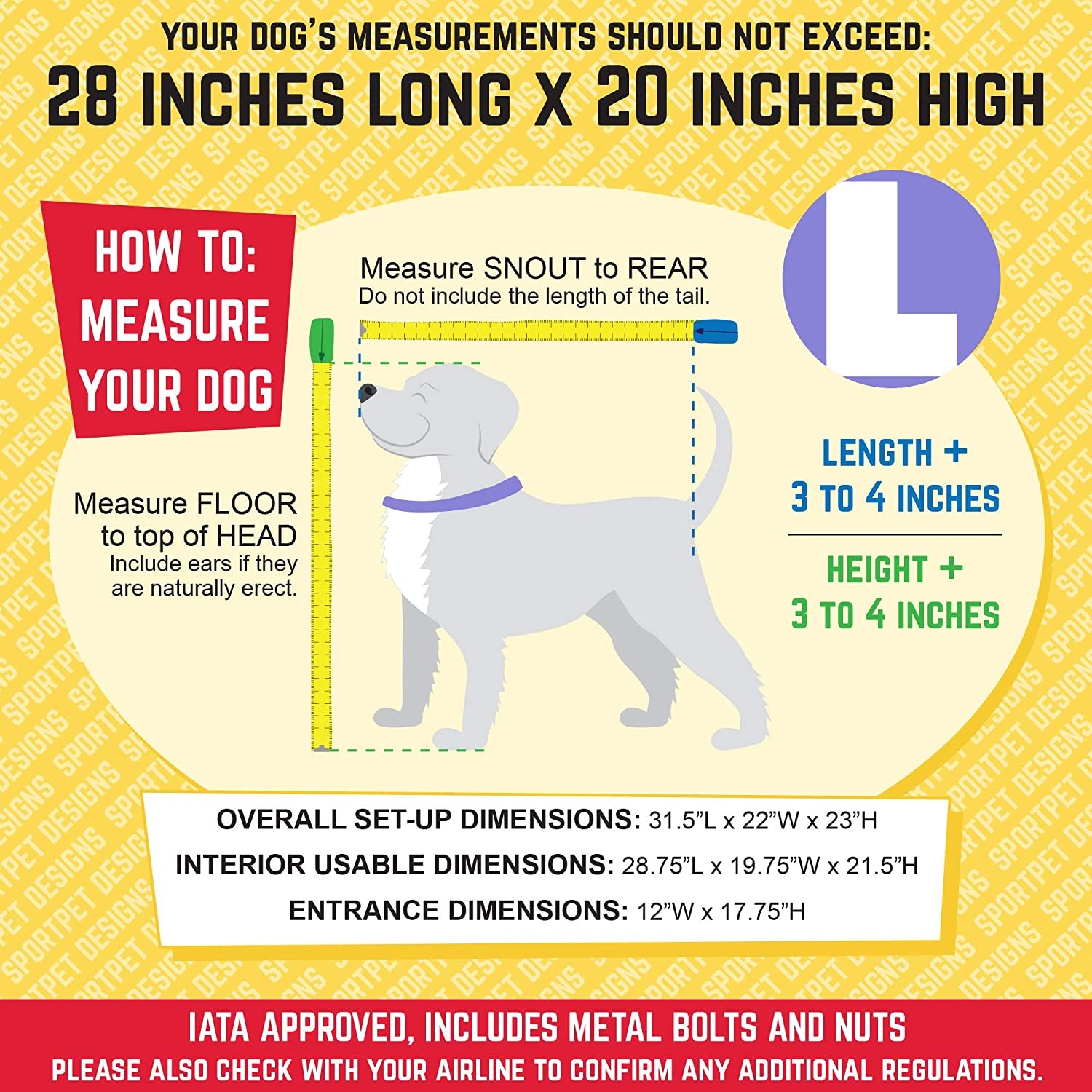 This is a plastic kennel designed for a lifetime of use. Our plastic crate will be your “go to” everyday home crate and Travel kennel. Please head to http: //SportPet/kennel sizing for help sizing your dog and to ensure you buy the correct size kennel. We also had airline travel in mind when designing this kennel. We include everything you need should you chose to ever fly with your dog. Check out our VIDEO here on this page for a quick tour of kennel features. Crate/ kennel assembly is fast and easy. Locking snaps hold the kennel halves together; additional included metal hardware locks the kennel together giving you peace of mind that your crate will make it safe and secure. Some dogs chew their escape through plastic ventilation holes. We use metal slats to mitigate the chewing problem and keep your pet safe. Accident moat pulls spills away from your pet’s body, out to the edges of the kennel strong metal kennel door with a smooth, easy-to-grasp latch thick impact resistant poly shell can take a wallop and keep on going pet parents should check with their airline before a trip. Airline and cargo carrier rules vary between countries and airlines. Pet crating and kennel shipment rules do change regularly, so be sure to check with proper authority about Pet shipments, Reds, and pet certifications and immunizations before your pet’s travel date. Limit kennel Time, don’t park under the sun, keep pet in ventilated areas with temperature control and air movement. For pets and intended use only. Questions? Please contact our customer service at info@sportpet. Net
